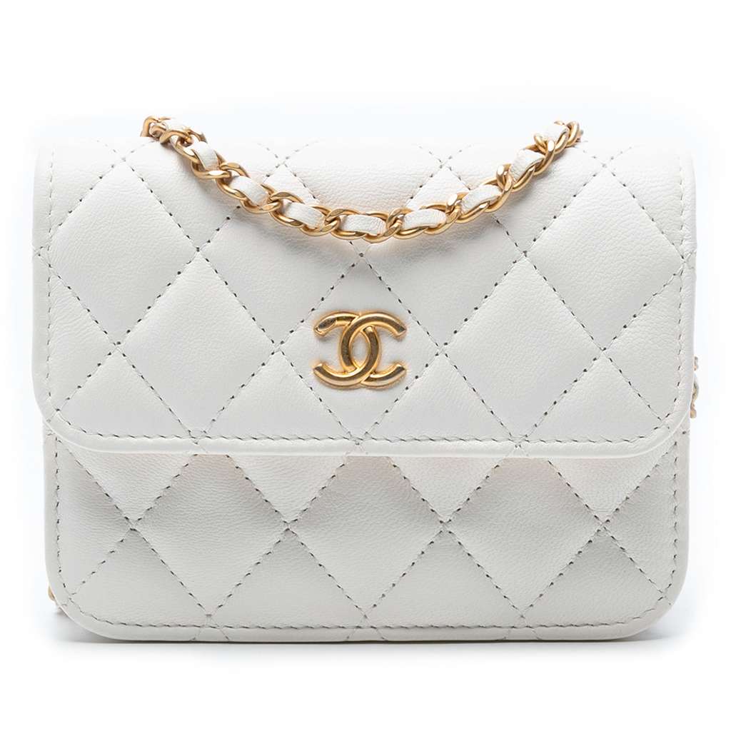 This crossbody bag features a quilted lambskin leather body, a leather-woven chain strap with ball details, and a top flap with magnetic snap closure.