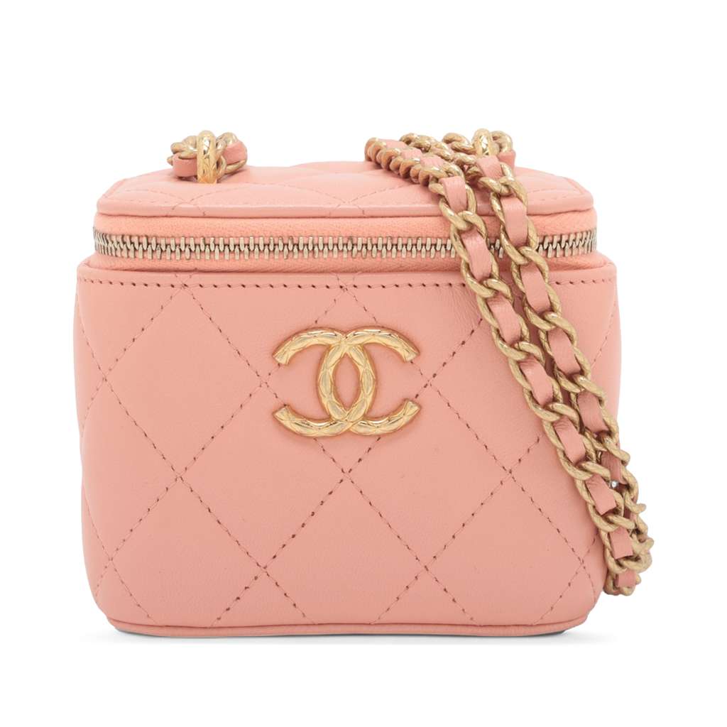 This vanity bag features a quilted lambskin leather body, a leather woven chain strap, a zip around closure, and an interior mirror.