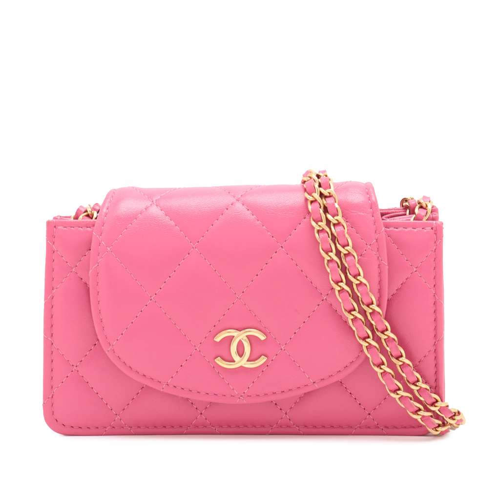 This wallet on chain features a quilted lambskin body, a leather woven chain shoulder strap, a flap with snap button closure, interior slip pockets, and interior card slots.
