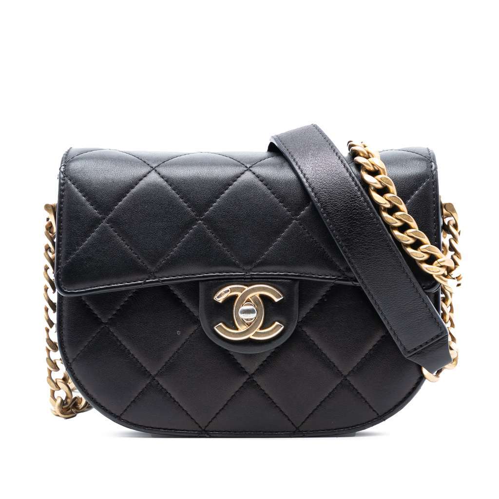This crossbody features a quilted leather body, a chain link shoulder strap with leather guard , a front flap with CC turn lock closure, an exterior back slip pocket, and an interior slip pocket.