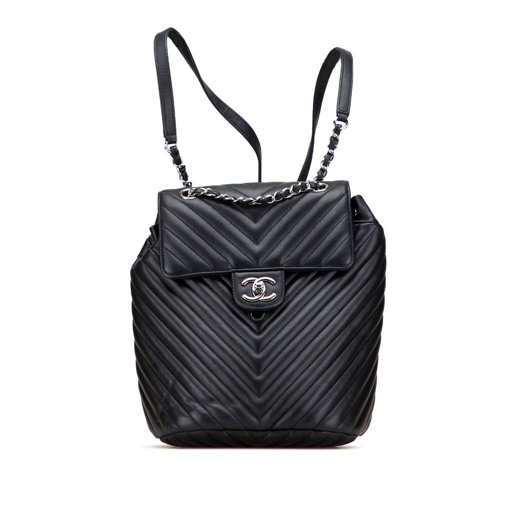 This backpack features a quilted calf leather body, a silver-tone leather-woven chain link handle, adjustable flat back shoulder straps, a top flap with interlocking CC twist lock closure, drawstring closure, an exterior back slip pocket, and interior zip and slip pockets.