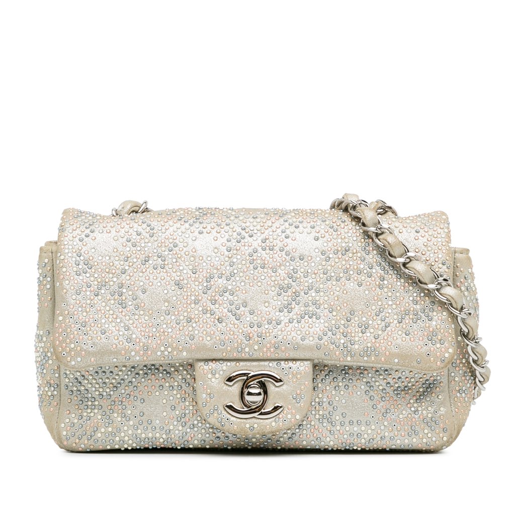 This crossbody bag features an iridescent and studded leather body, a leather-woven chain strap, a flap with CC turn lock closure, and interior zip and slip pockets.
