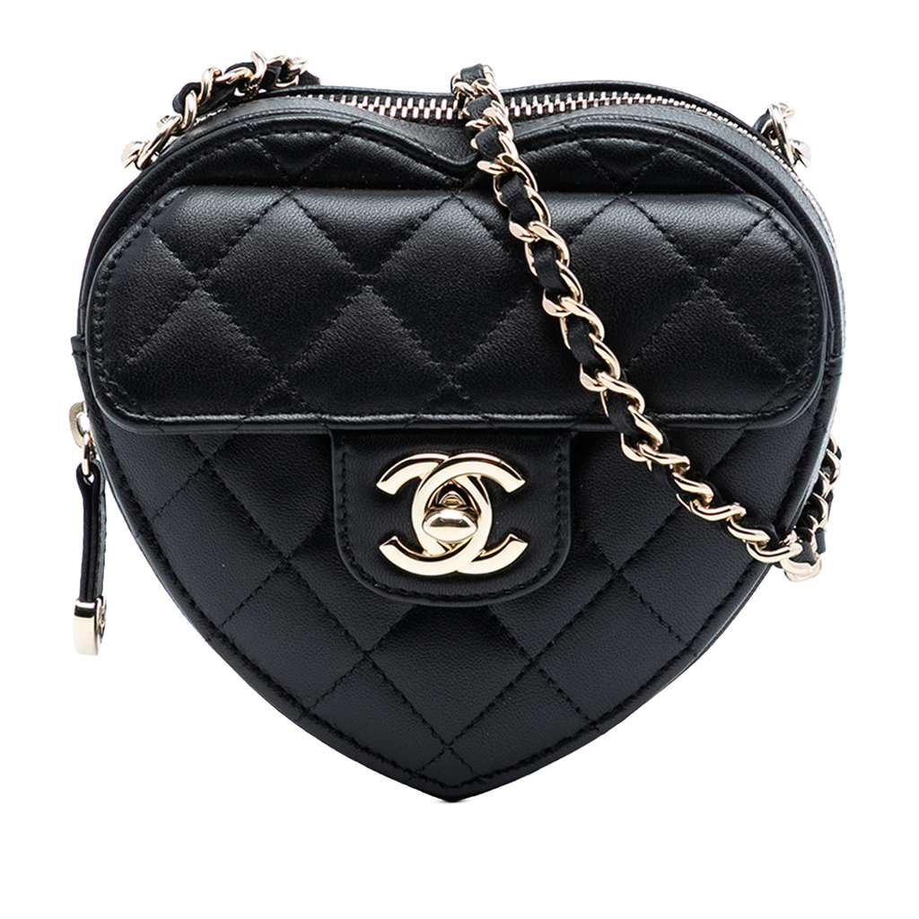 This crossbody bag features a quilted lambskin leather body, a leather woven chain shoulder strap, a zip-around closure, an exterior front flap pocket with CC turn-lock closure, and an exterior back slip pocket.