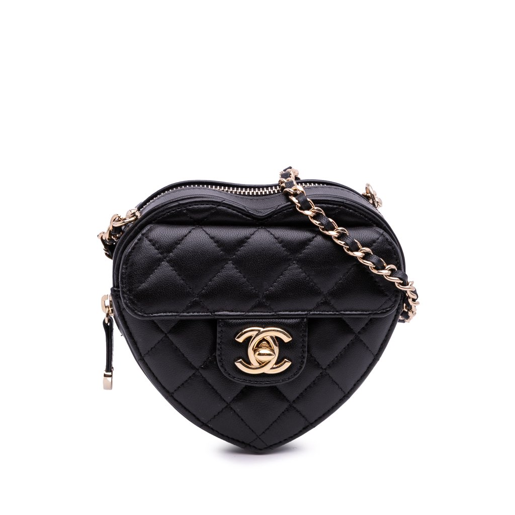 This crossbody bag features a quilted lambskin leather body, a leather woven chain shoulder strap, a zip-around closure, an exterior front flap pocket with CC turn-lock closure, and an exterior back slip pocket.