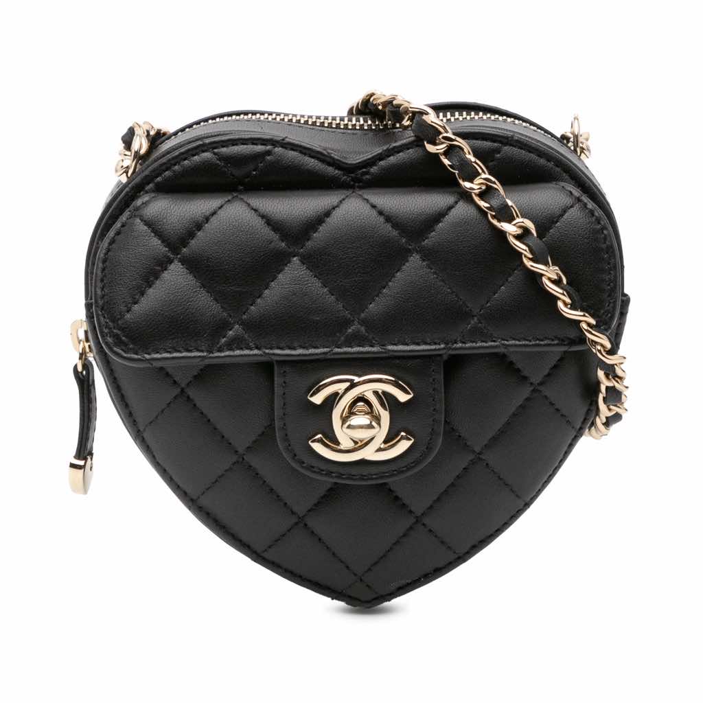 This crossbody bag features a quilted lambskin leather body, a leather woven chain shoulder strap, a zip-around closure, an exterior front flap pocket with CC turn-lock closure, and an exterior back slip pocket.