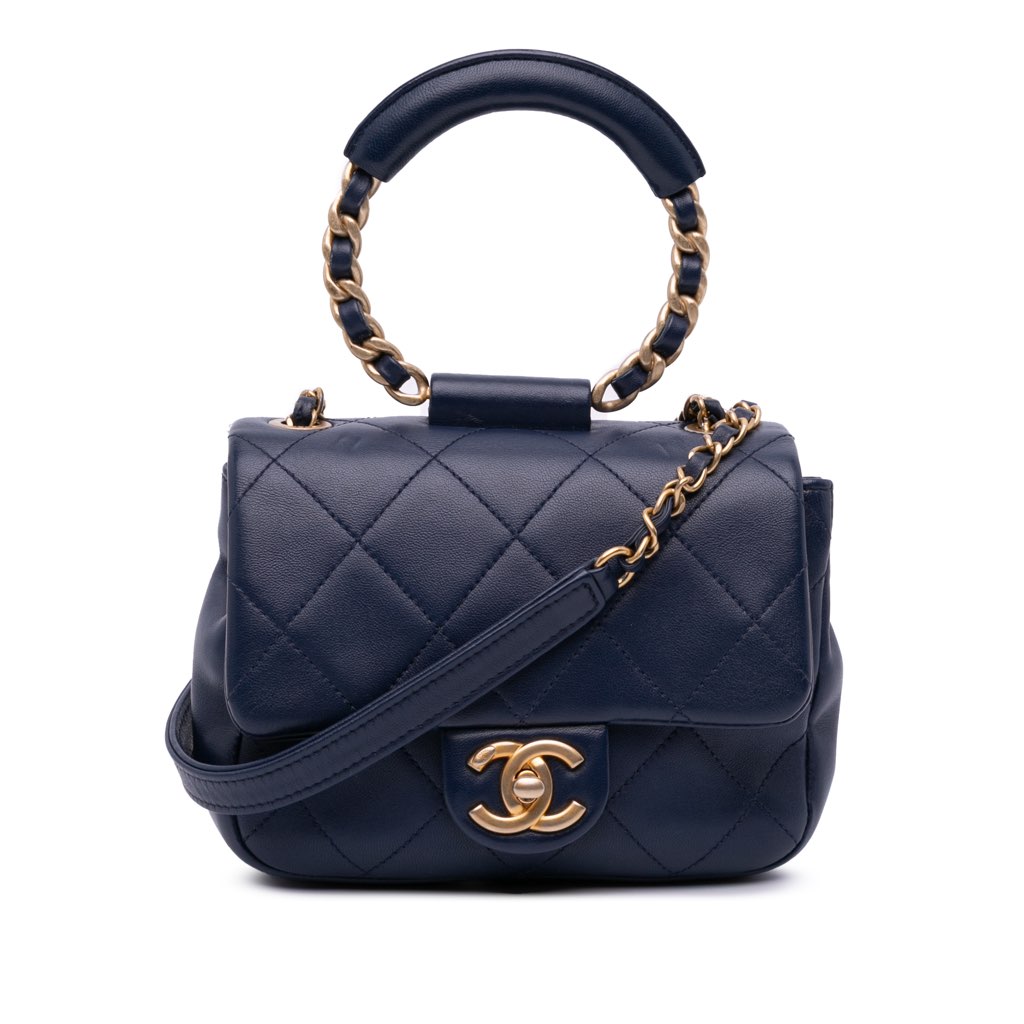This satchel features a quilted lambskin leather body, a hoop with leather woven chain handle, a leather woven chain strap with leather guard, a front flap with twist lock closure, and an interior slip pocket.