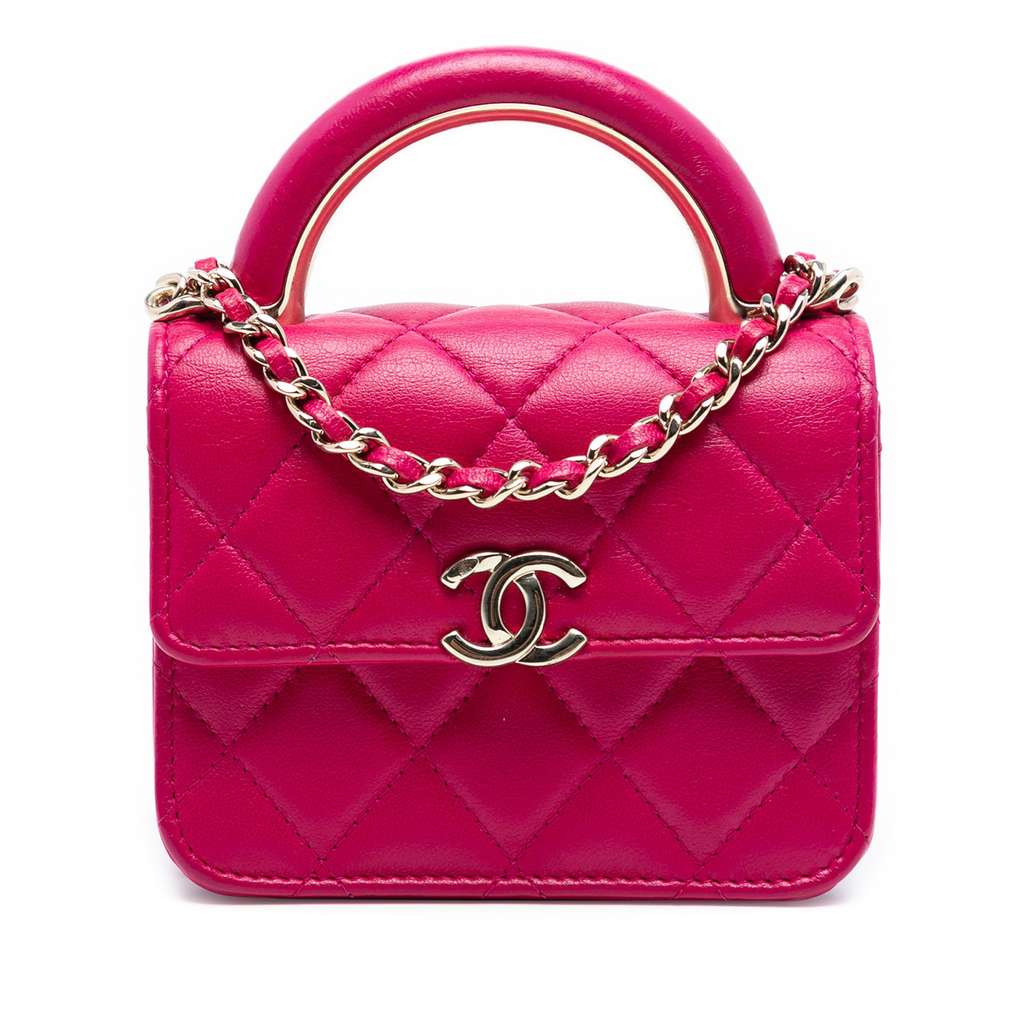 This satchel features a quilted lambskin leather body, rolled leather top handle, a leather woven-in chain strap, a front flap with magnetic snap closure, and interior slip pockets.