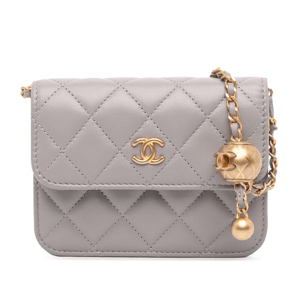 This clutch on chain features a quilted lambskin body, a leather woven chain strap with ball detail, and a front flap with snap closure.