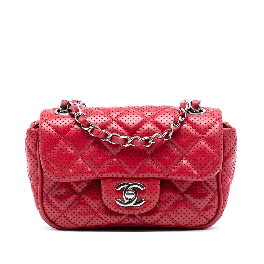 This crossbody bag features a quilted perforated lambskin leather body, a leather woven chain link shoulder strap, a front flap with a CC turn-lock closure, an exterior back slip pocket, and an interior slip pocket.