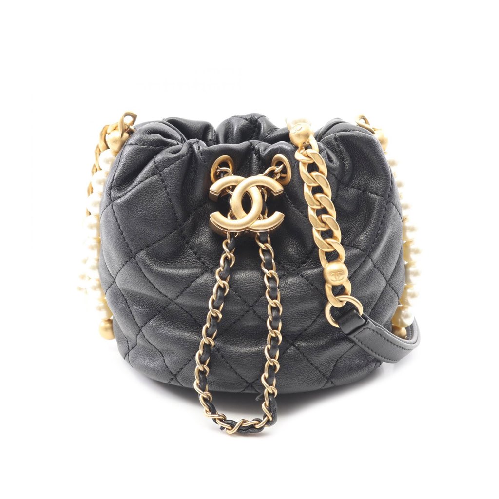 This bucket bag features a quilted leather body, a faux pearl strap with leather shoulder guard, and an open top with drawstring closure.