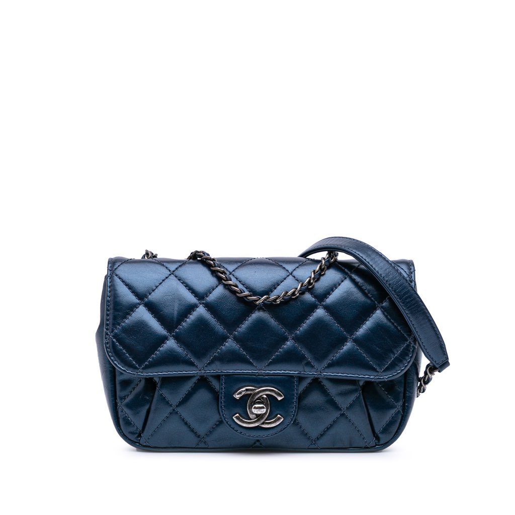 This crossbody bag features a quilted calfskin body with pleated front exterior, leather woven chain straps, a front flap with CC turn lock closure, and an interior zip pocket.