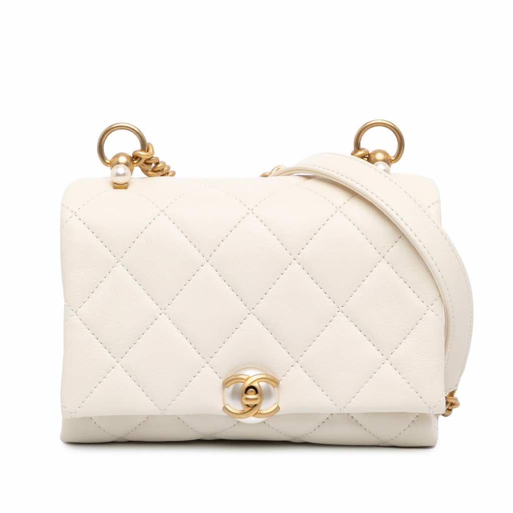 This flap bag features a quilted leather body, a chain link strap with leather shoulder guard, a front flap with CC turn lock closure, an exterior slip pocket, and an interior slip pocket.