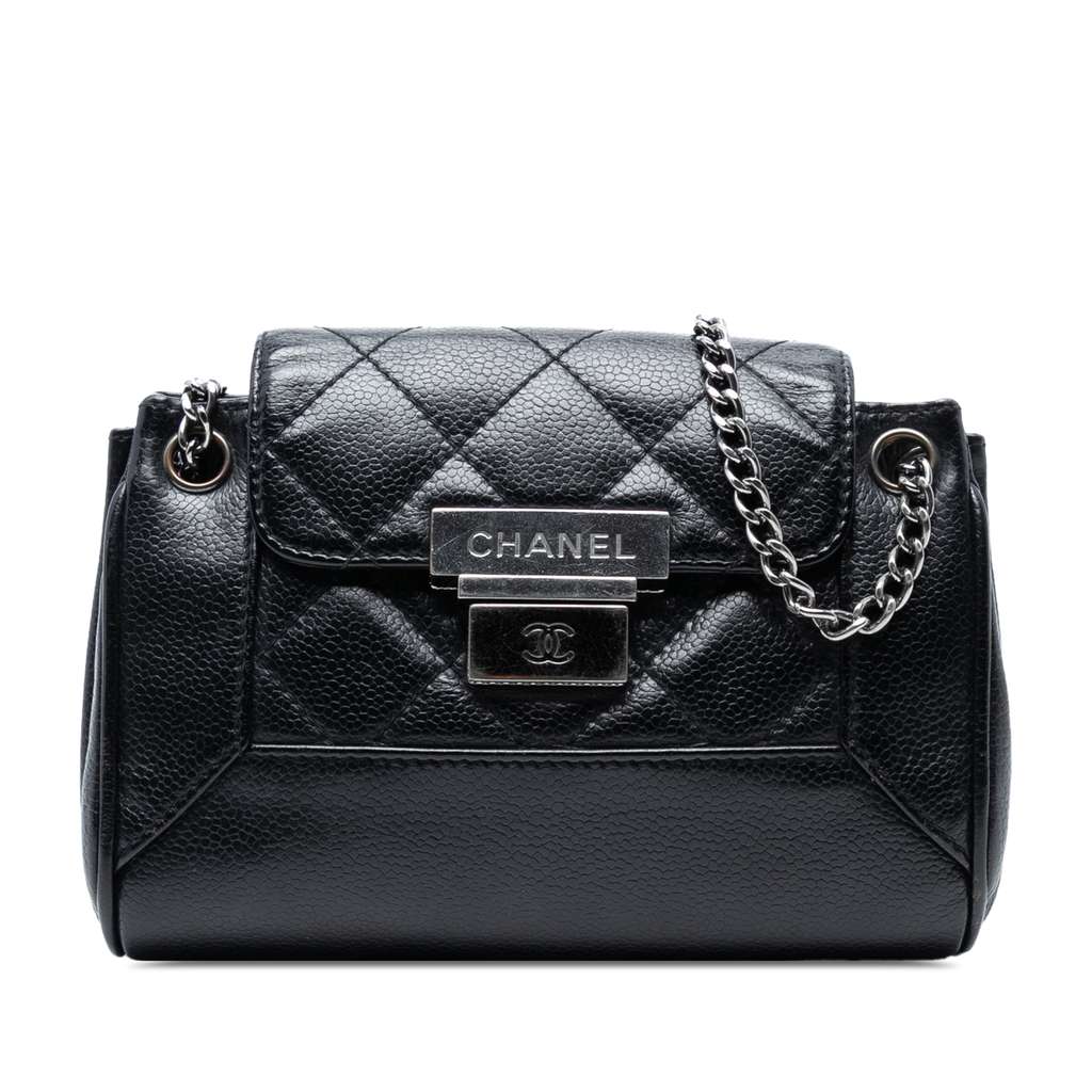 This shoulder bag features a quilted caviar leather body, chain link straps with leather guard, a front flap with push lock closure, and an interior slip pocket.