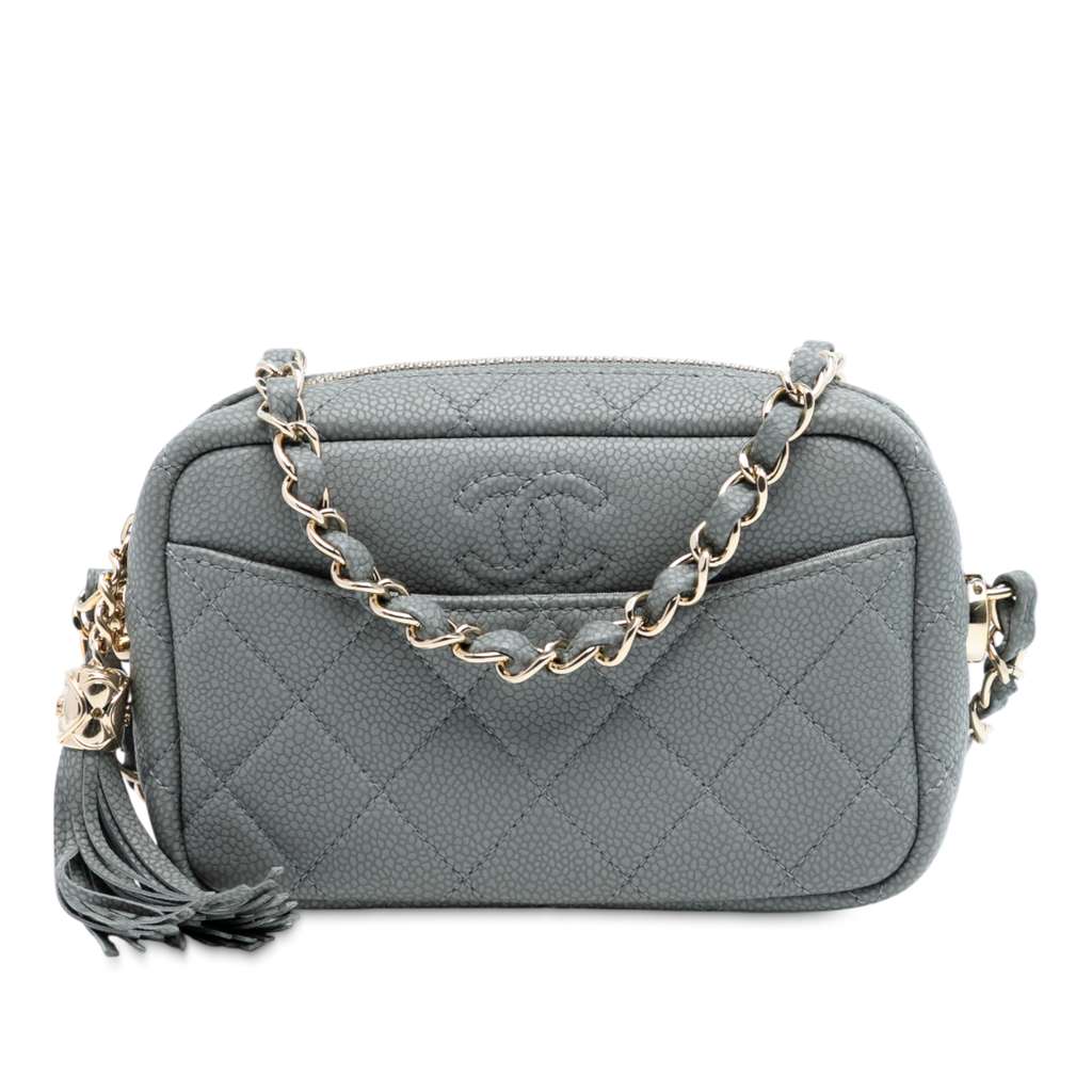 This crossbody bag features a quilted caviar leather body, a leather-woven chain strap, a top zip closure with tassel detail, and an exterior front slip pocket.