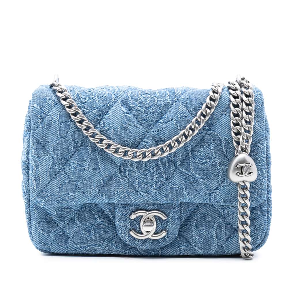 This flap bag features a quilted denim body, a chain link shoulder strap, a front flap with CC turn lock closure, an exterior back slip pocket, and an interior slip pocket.