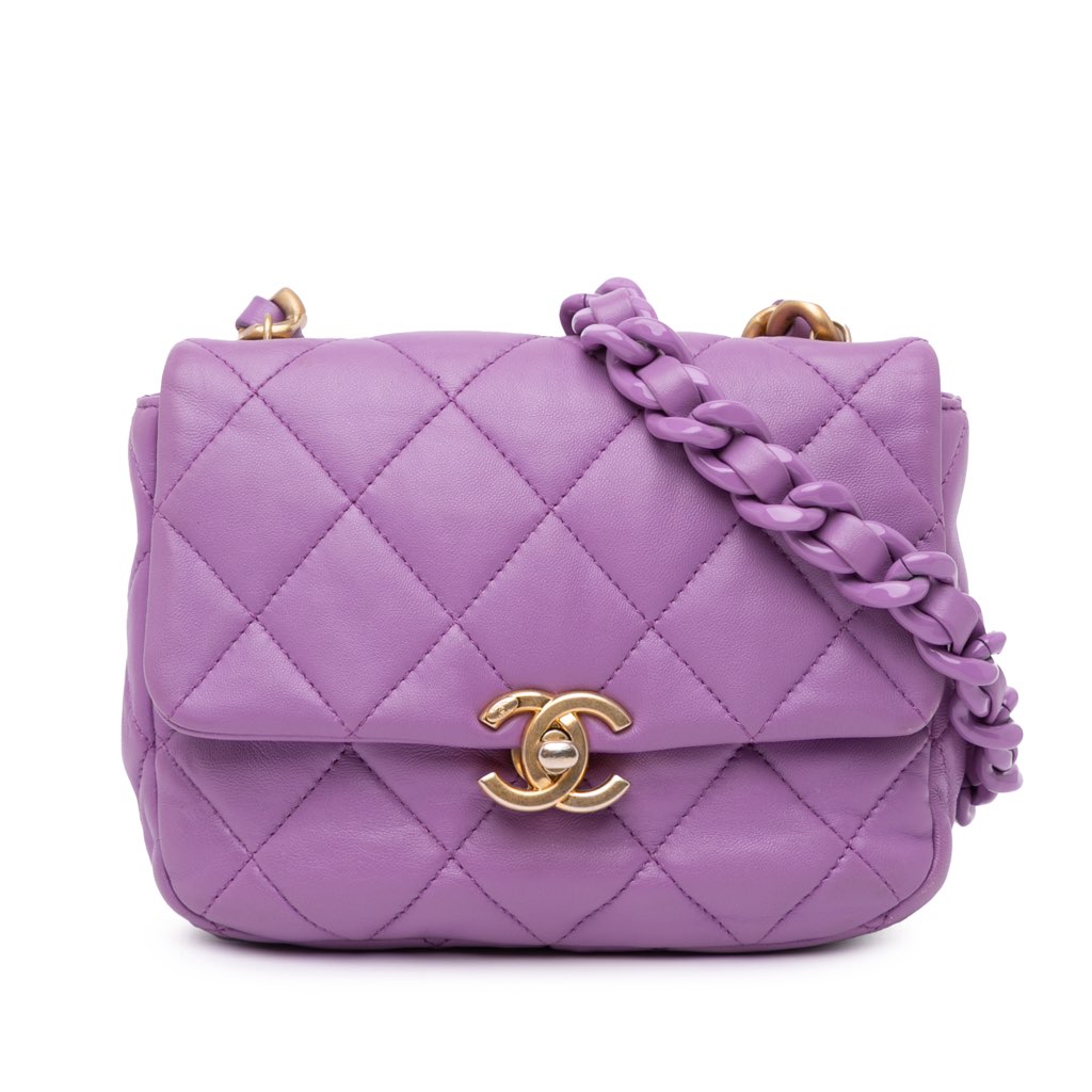 This crossbody features a quilted lambskin leather body, a leather woven chain strap, a front flap with twist lock closure, and an interior slip pocket.