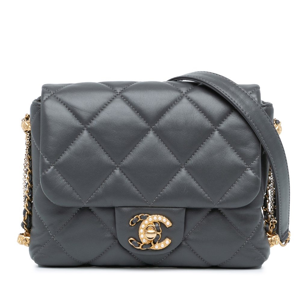 This crossbody bag features a quilted lambskin leather body, leather-woven chain shoulder straps with flat leather shoulder guard, a front flap with CC turn-lock closure, and an interior slip pocket.