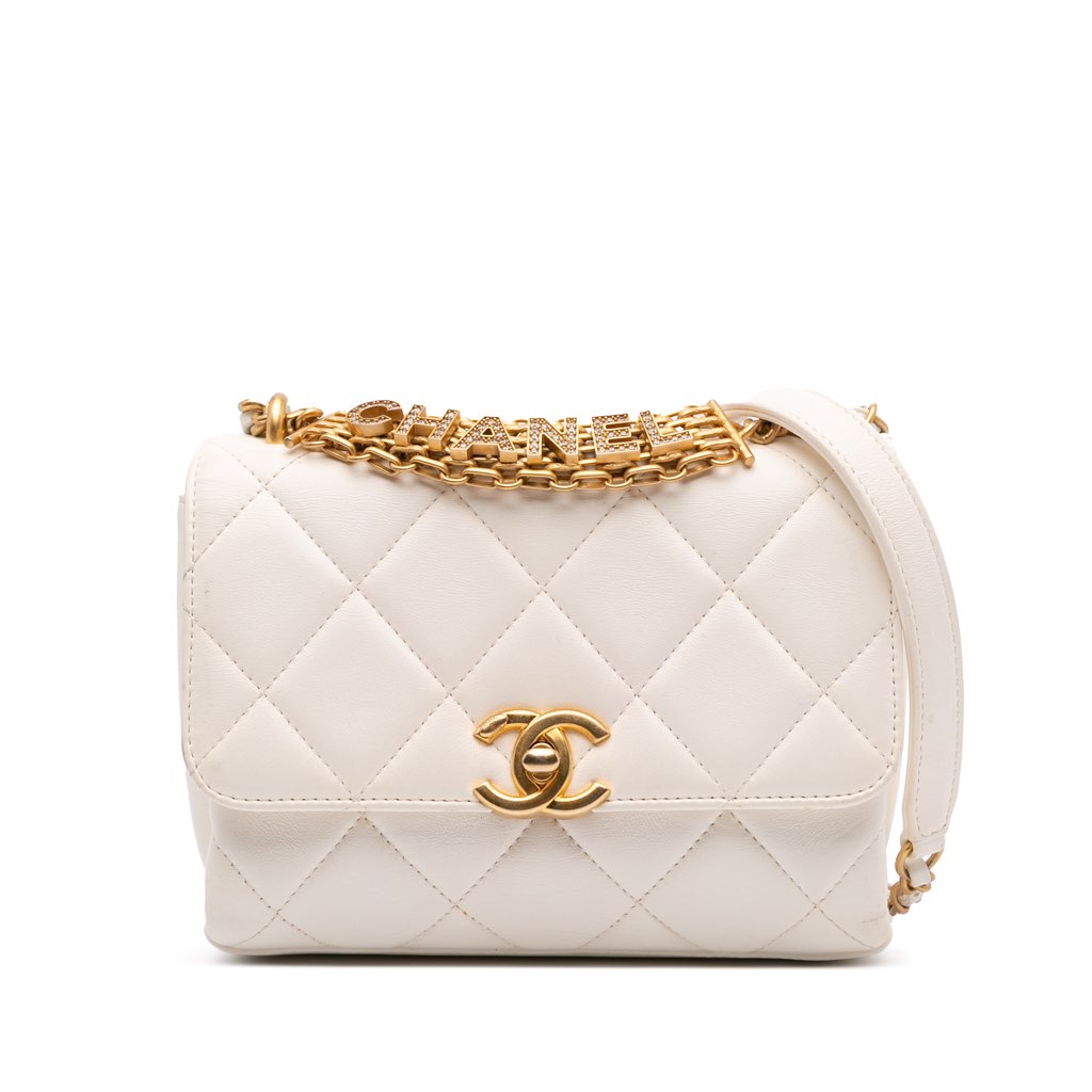 This satchel features a quilted lambskin leather body, a gold-tone chain handle with logo and crystal details, a leather-woven chain strap with leather guard, a front flap with CC turn-lock closure, and an interior slip pocket.