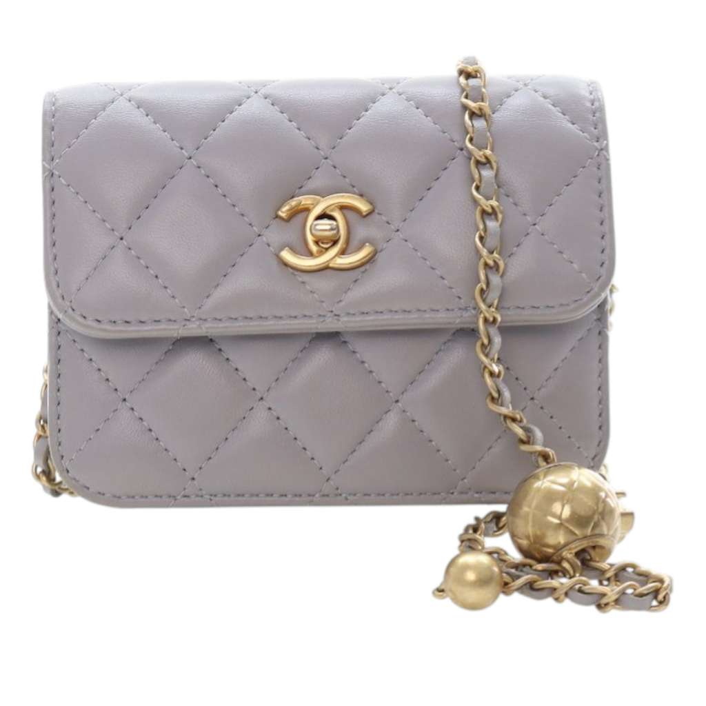 This crossbody bag features a quilted lambskin leather body, a leather-woven chain strap with ball details, and a top flap with interlocking CC and magnetic snap button closure.