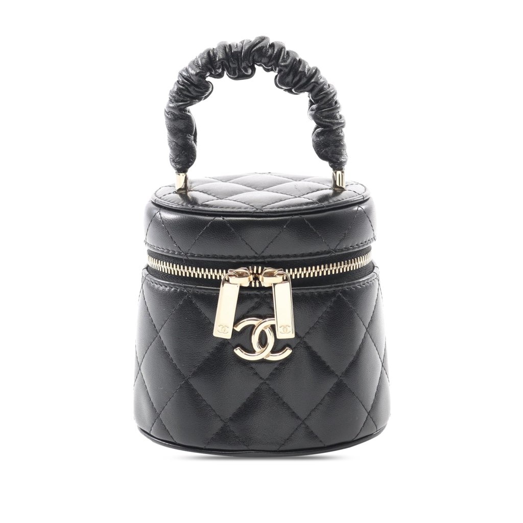This vanity bag features a quilted lambskin body, a ruched top handle, a top zip around closure, an interior mirror, and an interior slip pocket.