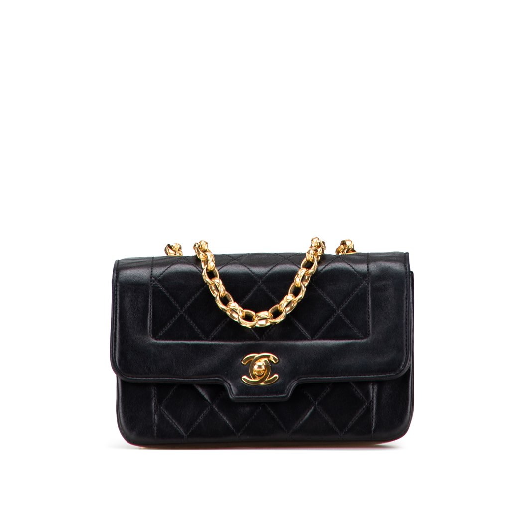 This crossbody bag features a quilted lambskin leather body, a gold-tone shoulder chain strap, a front flap with turn lock closure, and an interior zip pocket.