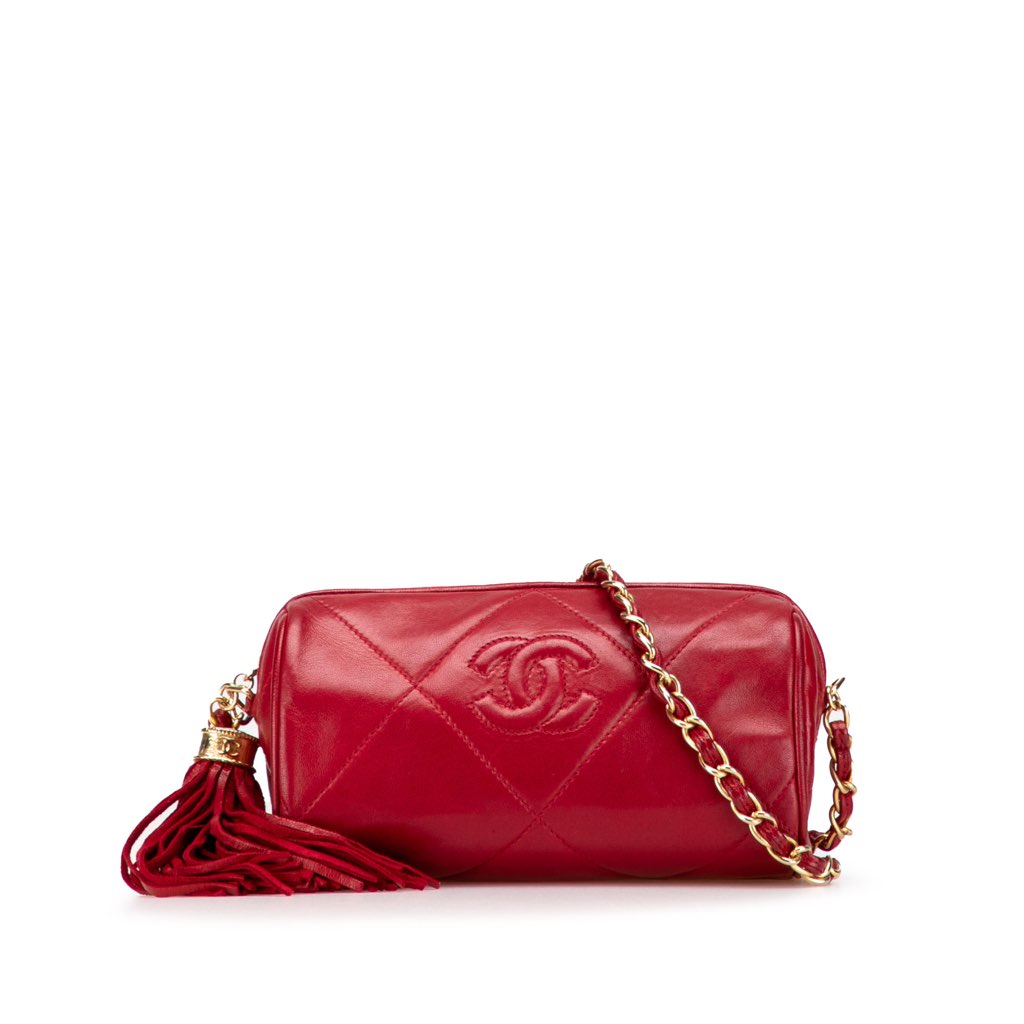 This crossbody bag features a quilted lambskin leather body, a leather tassel, a leather woven chain strap, a top zip closure, and an interior zip pocket.