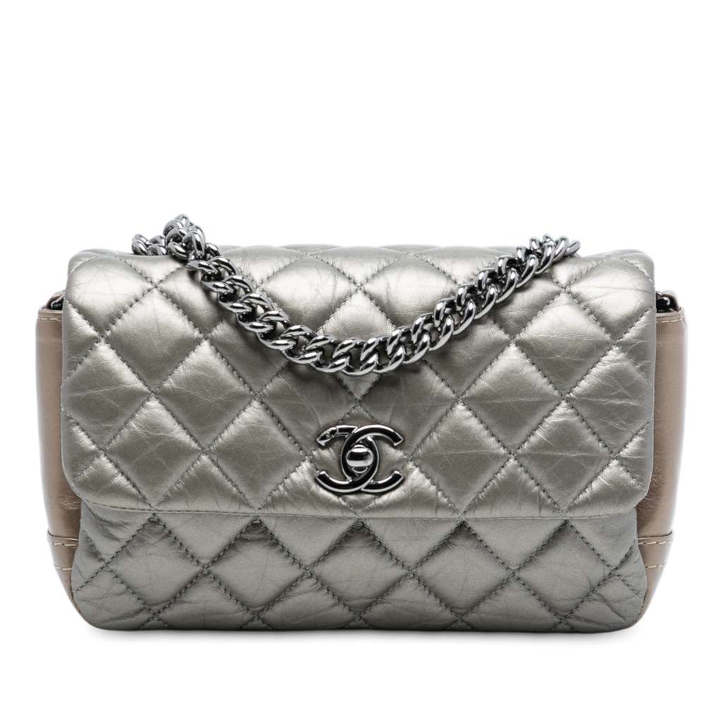 This flap bag features a quilted leather body, a chain and leather shoulder strap, a front flap with CC turnlock closure, and interior slip compartments.