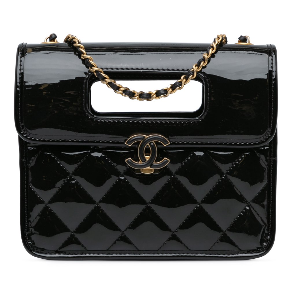 This crossbody features a quilted patent leather body, a structured front flap with magnetic closure with cutout handles, leather woven chain strap, an exterior back slip pocket, and interior zip and slip pockets.