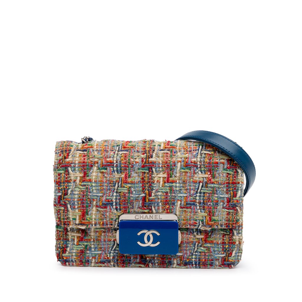 This crossbody bag features a quilted tweed body, a leather woven chain strap with leather guard, a front flap with push-lock closure, and an interior zip pocket.