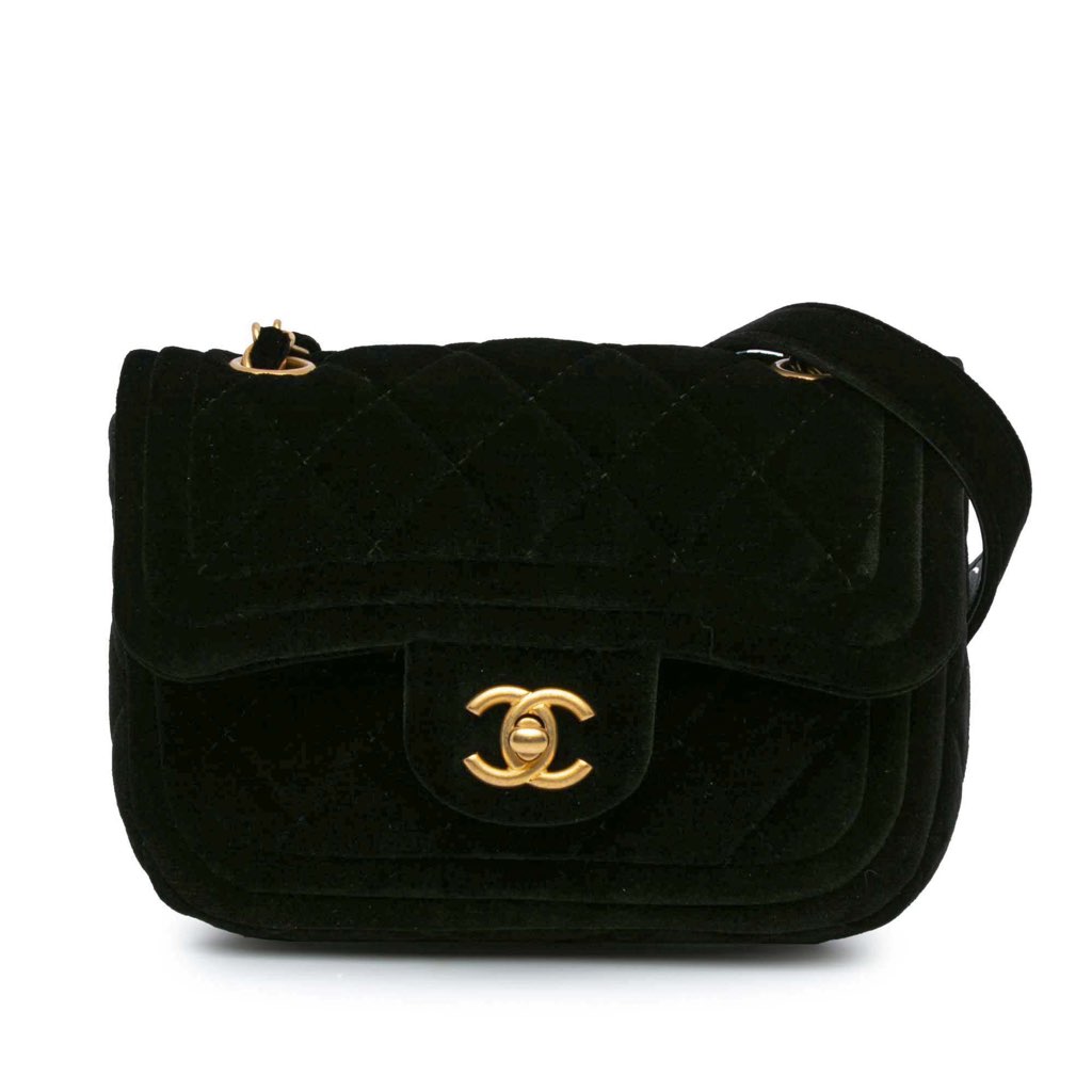 This flap features a quilted velvet body, a velvet-woven chain strap with velvet guard, a front flap with twist lock closure, exterior front and back slip pockets, and interior zip and slip pockets.