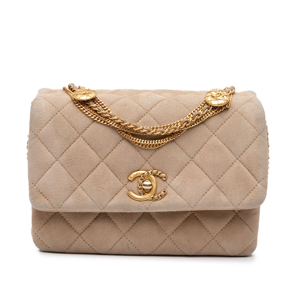 This flap bag features a quilted velvet body, a leather-woven chain strap with accent, a front flap with CC turn lock closure with accent, and interior compartments.
