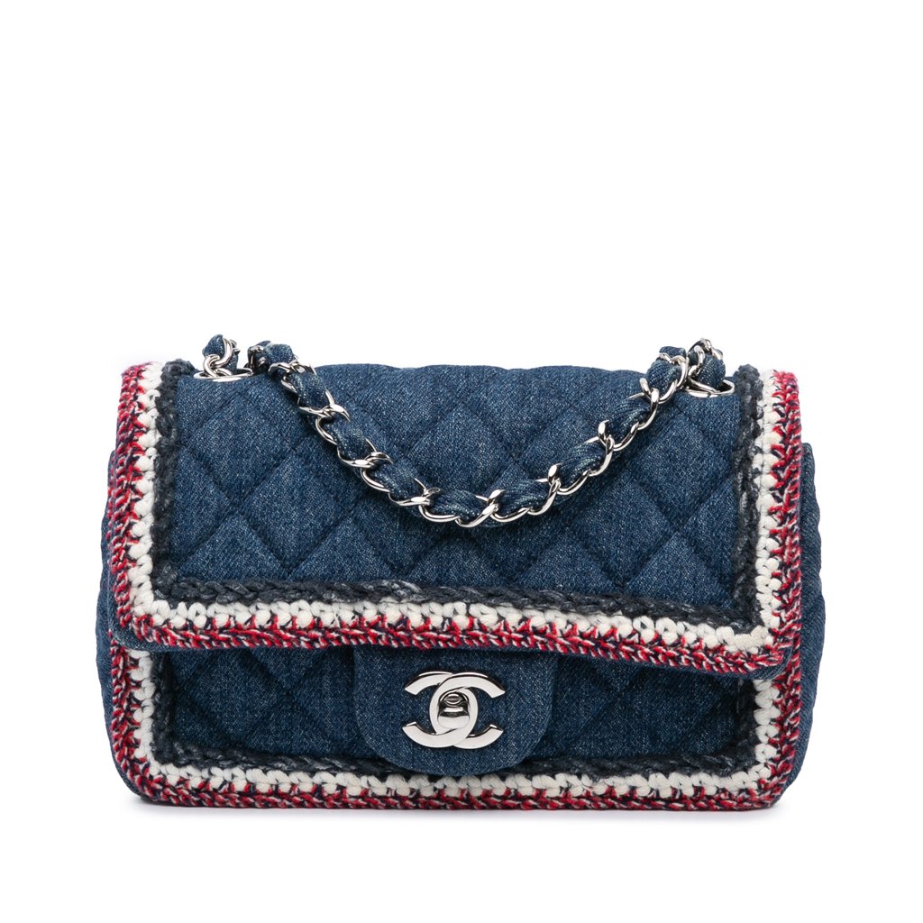 This shoulder bag features a quilted denim body with tweed trim, denim woven chain link strap, an exterior slip pocket, and interior zip and slip pockets.