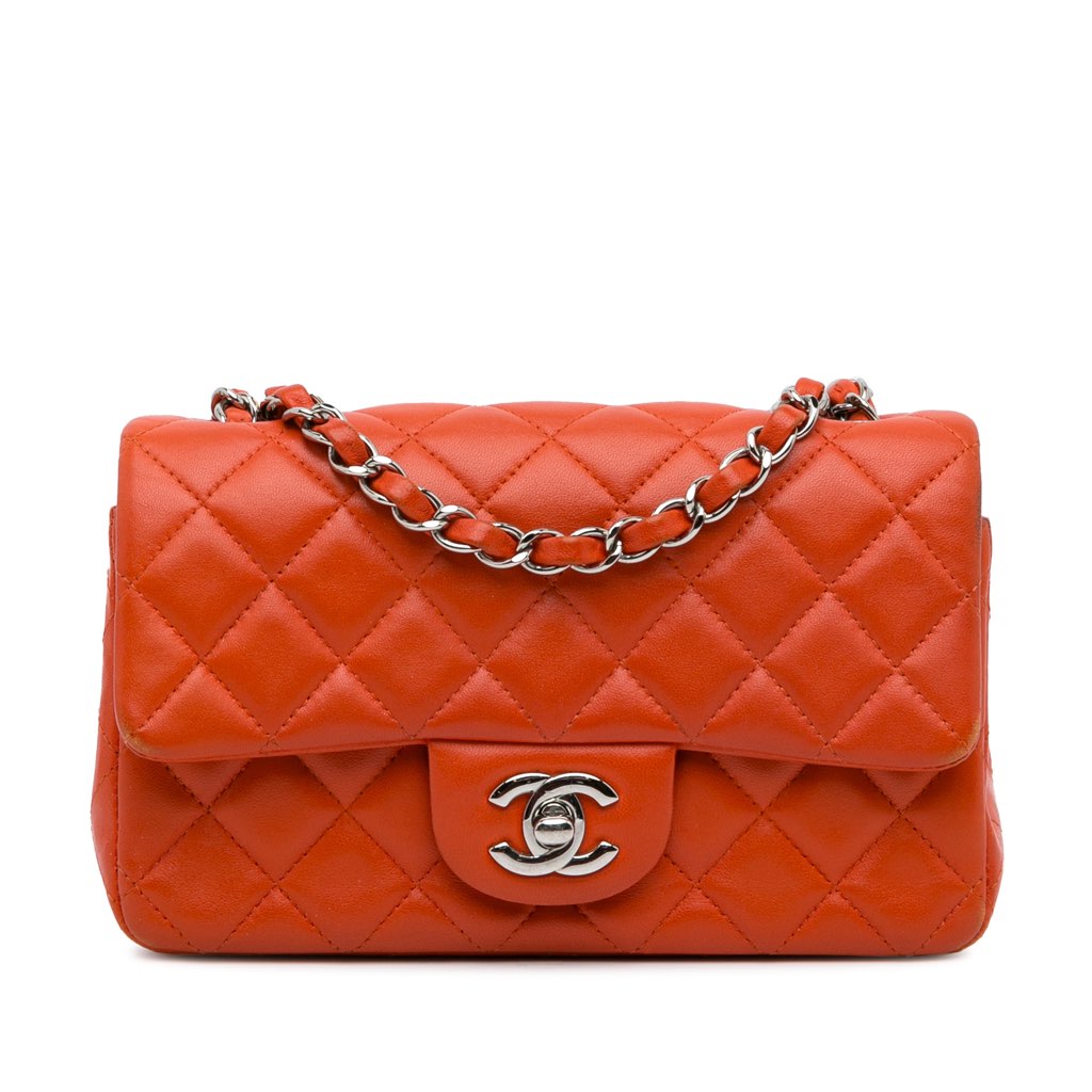 This flap bag features a quilted lambskin body, a leather woven chain shoulder strap, a front flap with a twist lock closure, an exterior back slip pocket, and interior zip and slip pockets.