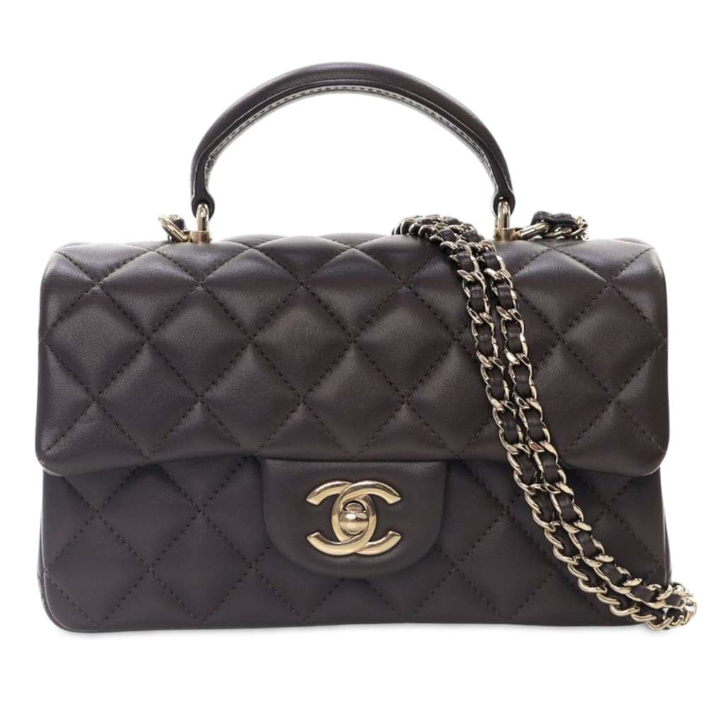 This satchel features a quilted lambskin leather body, a flat leather handle, a leather woven chain strap, a front flap with CC turn-lock closure, an exterior back slip pocket, and interior zip and slip pockets.