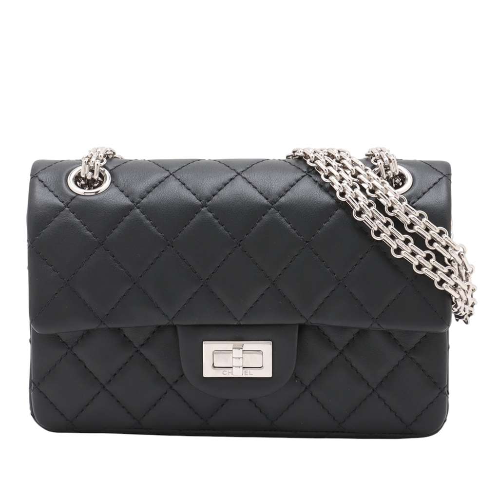 This flap bag features a quilted lambskin leather body, chain link shoulder straps, front flap with turn-lock closure, an exterior back slip pocket, and interior zip and slip pockets.