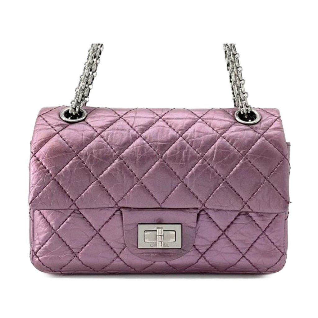 This flap features a quilted metallic lambskin body, leather woven chain straps, a front flap with turn lock closure, an exterior back slip pocket, and interior zip and slip pockets.