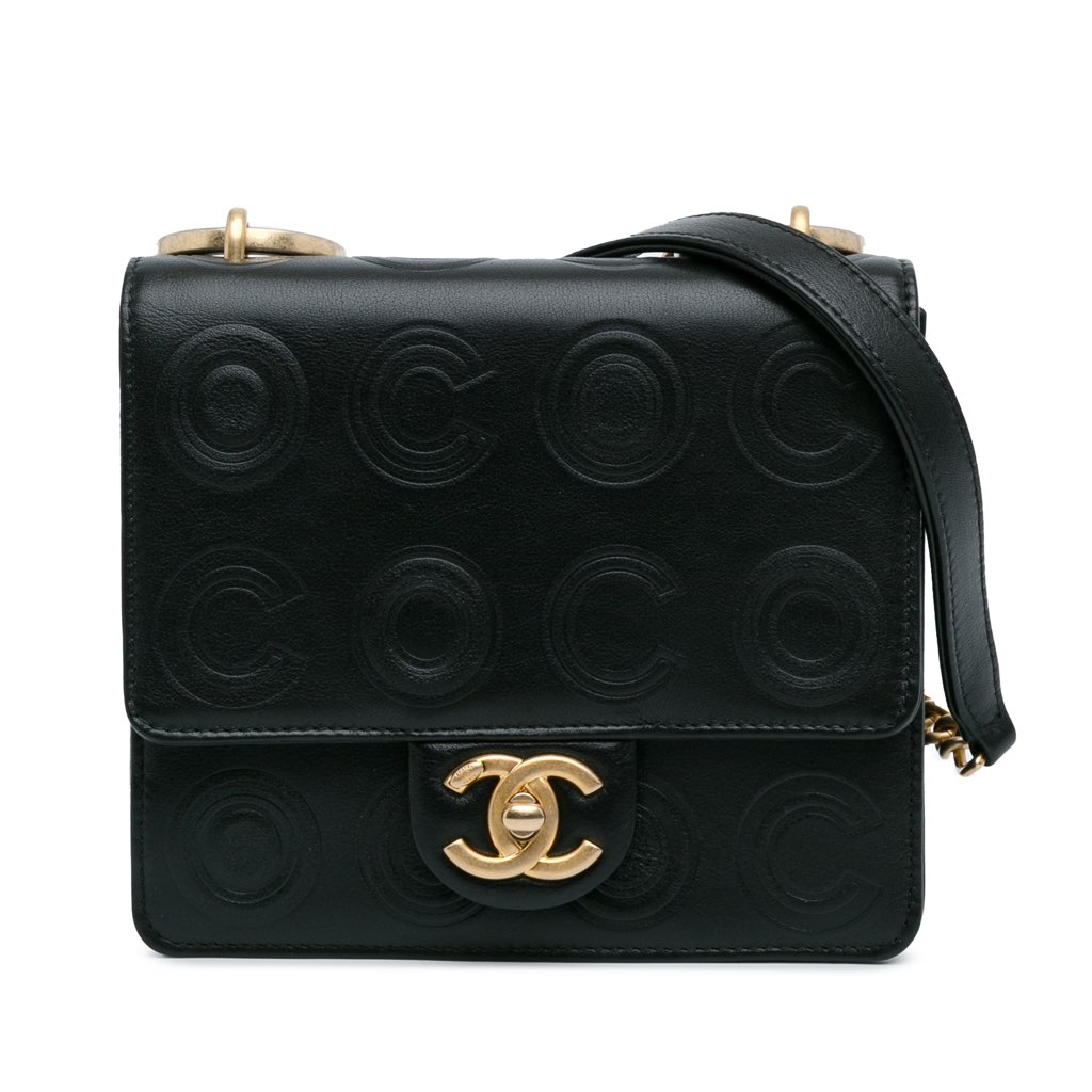 This crossbody bag features an embossed leather body, a chain link shoulder strap with leather guard, a front flap with interlocking Cs and a twist lock closure, an exterior back slip pocket, and an interior slip pocket.