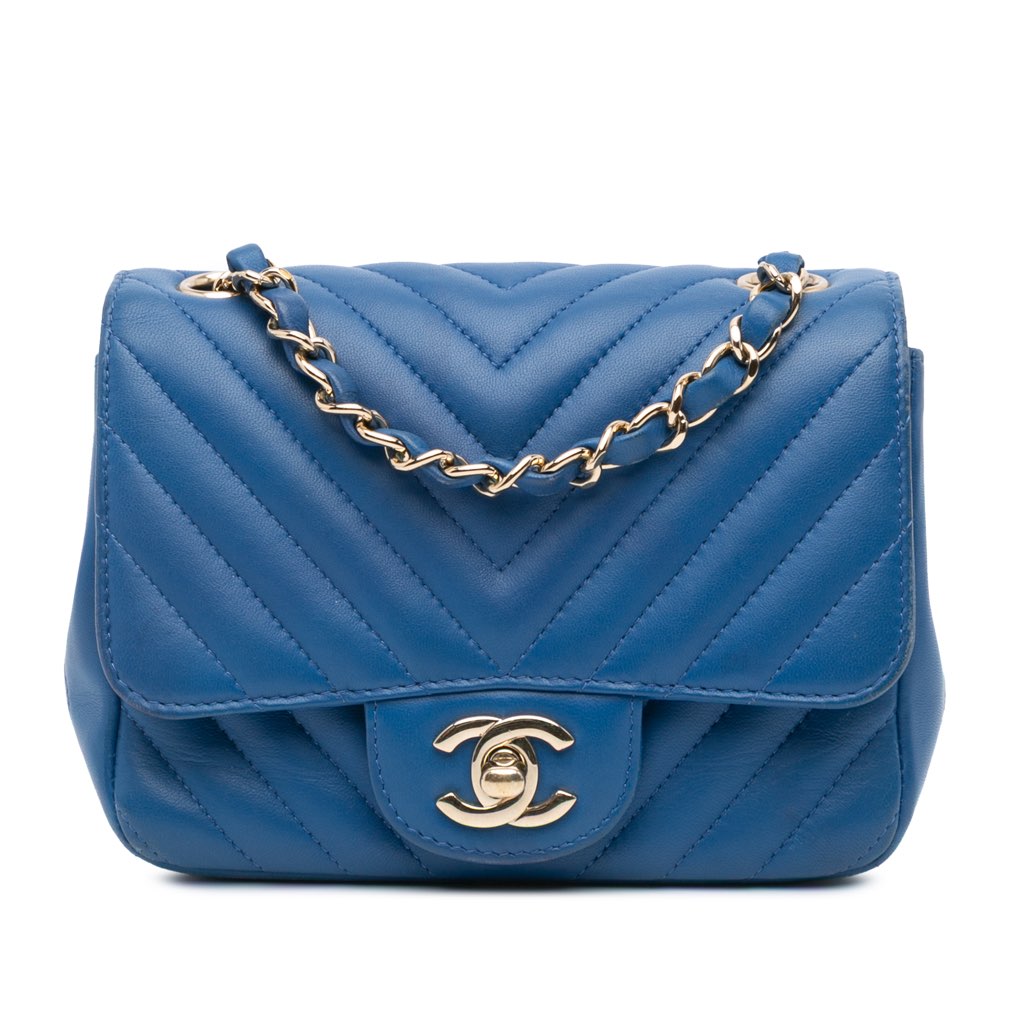 The Mini Chevron Classic Flap features a quilted lambskin leather body, a leather woven chain link strap, a front flap with CC turn lock closure, an exterior back slip pocket, and interior zip and slip pockets.