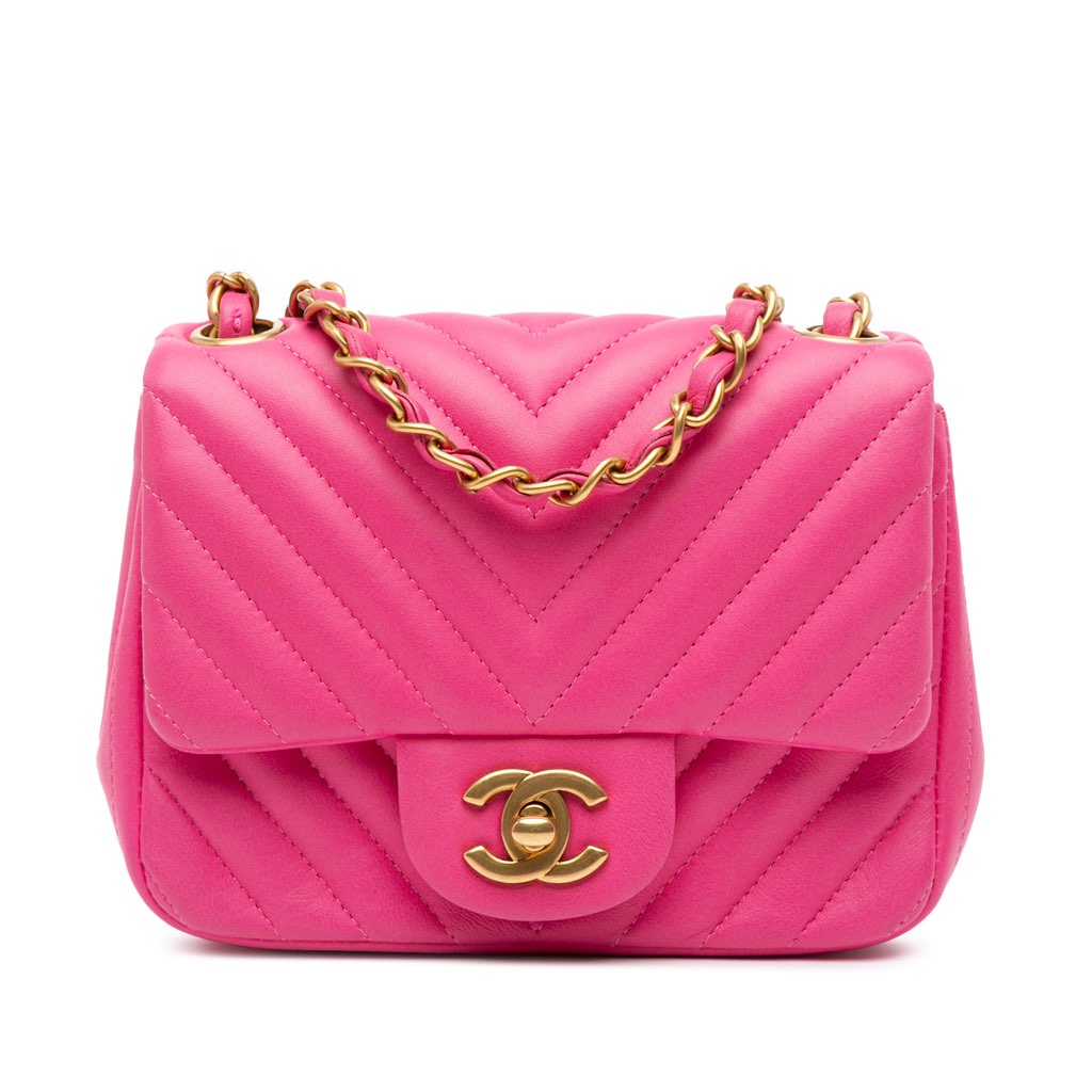 The Mini Classic Flap features a quilted leather body, a leather woven chain strap, a front flap with CC turn-lock closure, an exterior back slip pocket, and interior zip and slip pockets.