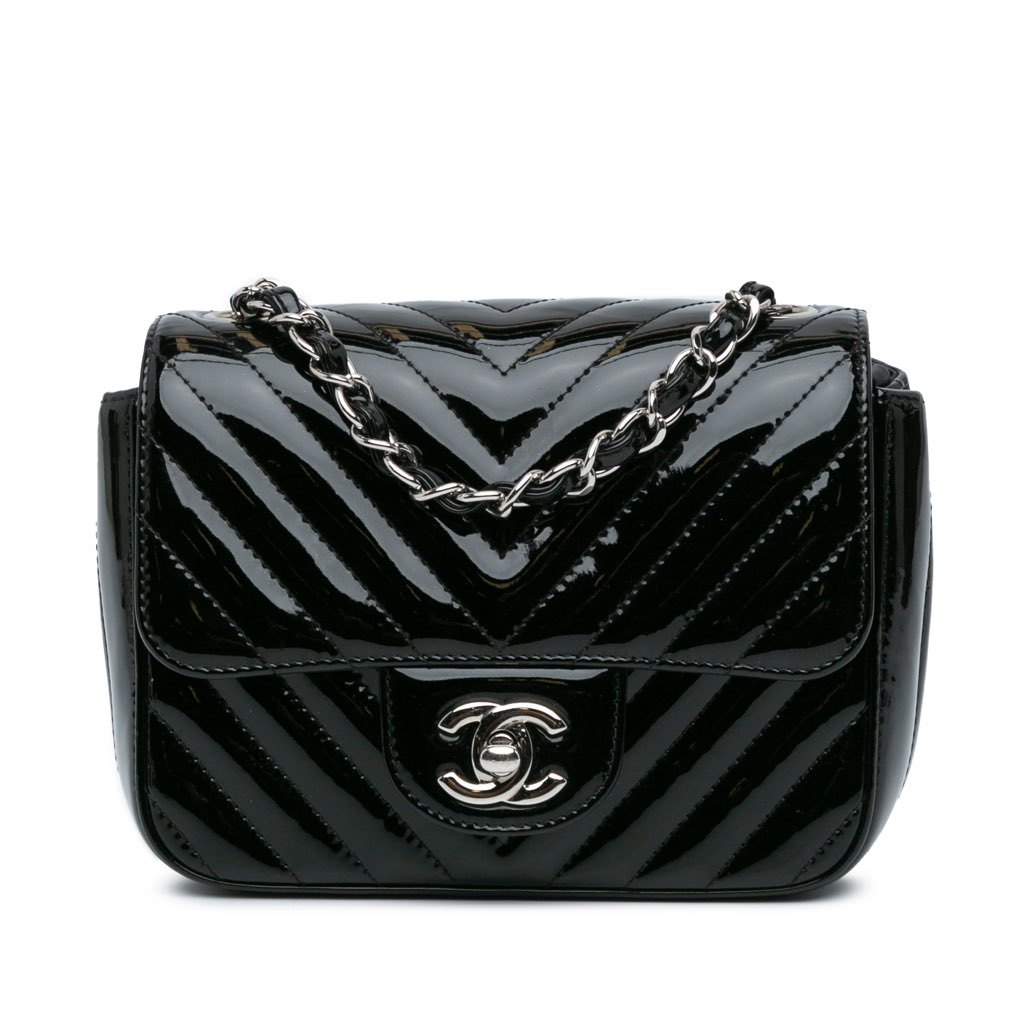 This shoulder bag features a quilted patent leather body, a leather woven chain link shoulder strap, a front flap with interlocking Cs and twist lock closure, an exterior back slip pocket, and interior zip and slip pockets.