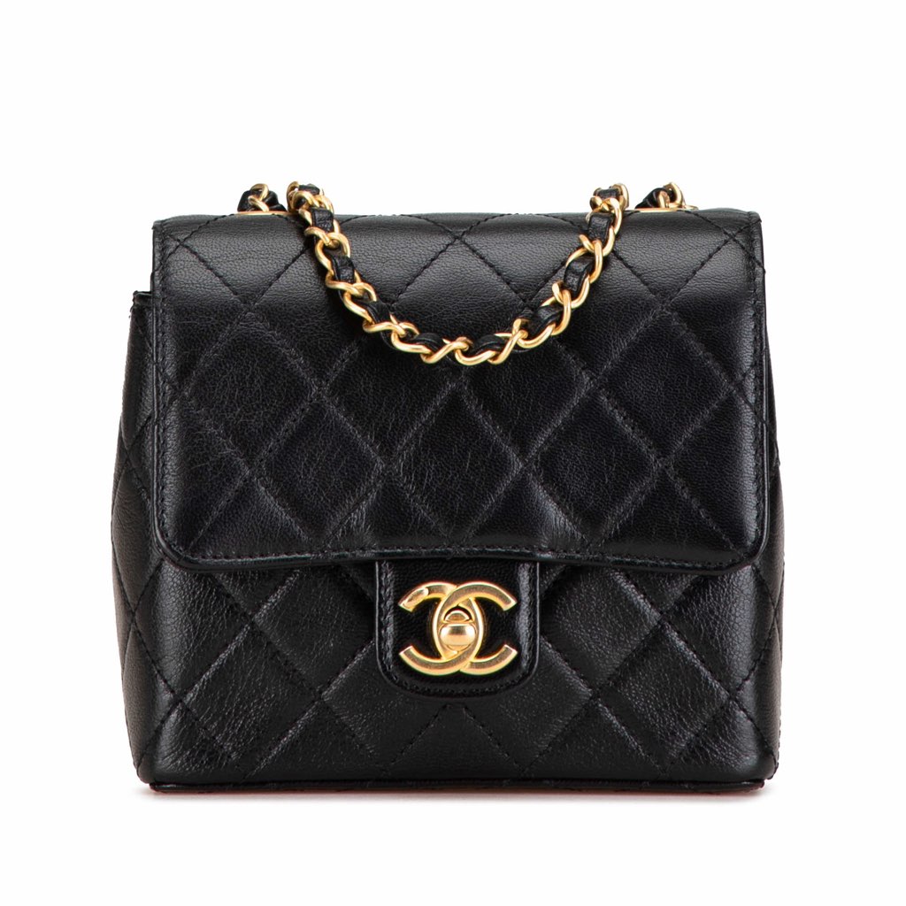 This crossbody features a quilted goatskin leather body, leather woven chain straps, a front flap with twist lock closure, and interior slip pockets.