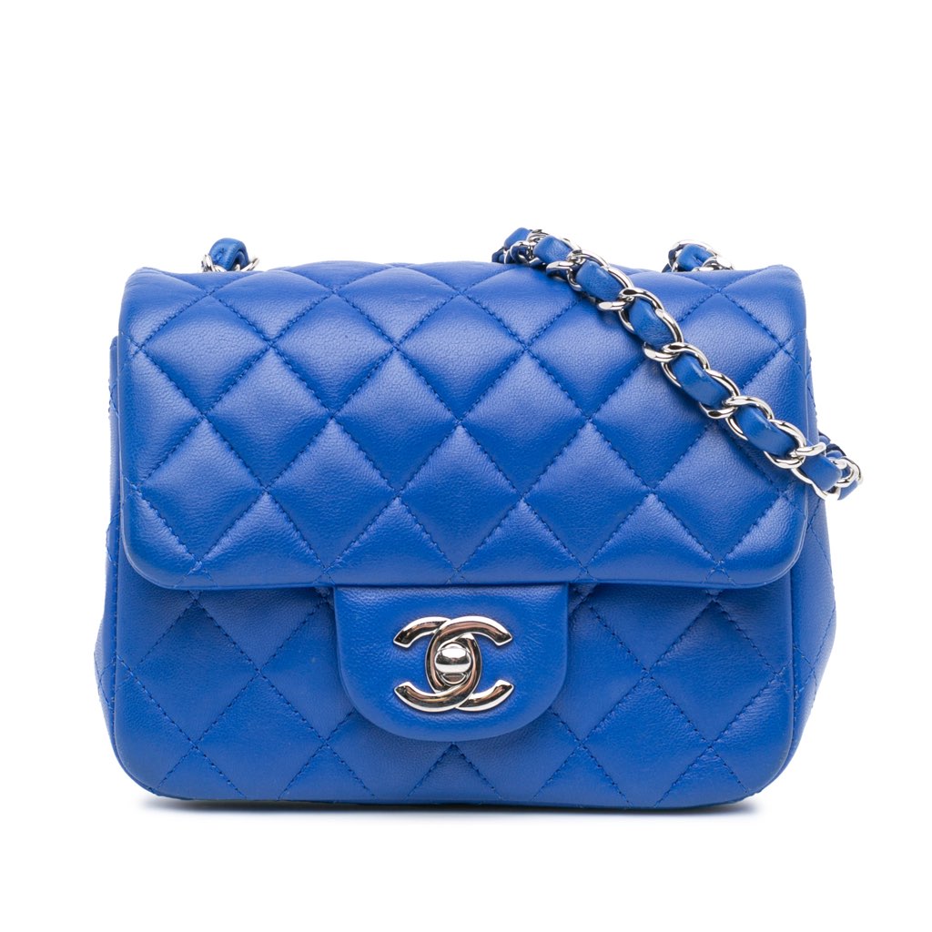The flap features a lambskin leather body, a leather woven chain shoulder strap, a front flap with turn lock closure, an exterior back slip pocket, and interior zip and slip pockets.