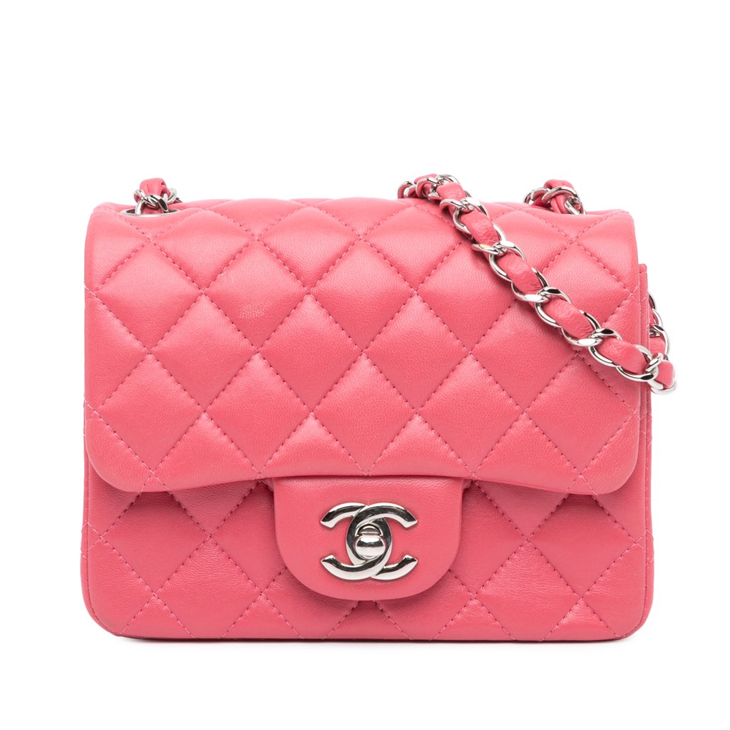 This flap bag features a quilted lambskin leather body, a leather woven chain link shoulder strap, a front flap with turn-lock closure, an exterior back slip pocket, and interior zip and slip pockets.