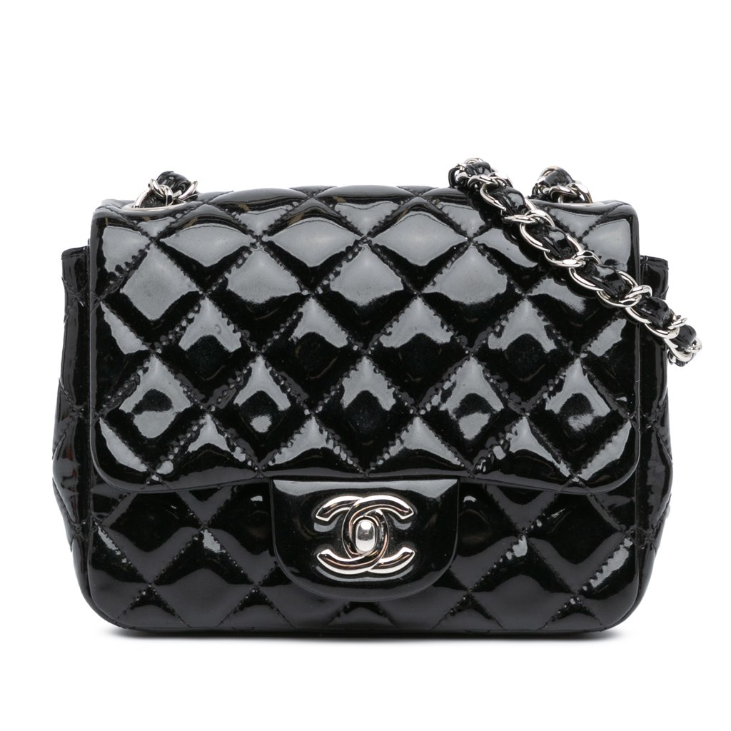 This flap features a quilted patent leather body, a leather woven chain shoulder strap, a front flap with interlocking Cs and a twist lock closure, an exterior back slip pocket, and interior zip and slip pockets.