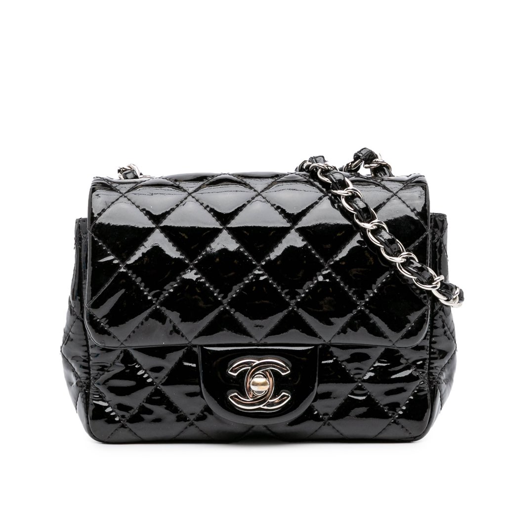 This flap bag features a quilted patent leather body, a leather woven chain link shoulder strap, a front flap with interlocking Cs and a twist lock closure, an exterior back slip pocket, and interior zip and slip pockets.
