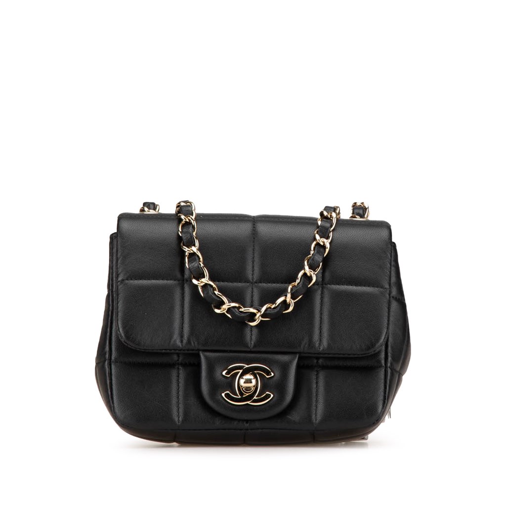 This crossbody bag features a quilted leather body, leather woven chain link strap with resin dice details, a front flap with twist lock closure, an exterior back slip pocket, and interior zip and slip pockets.