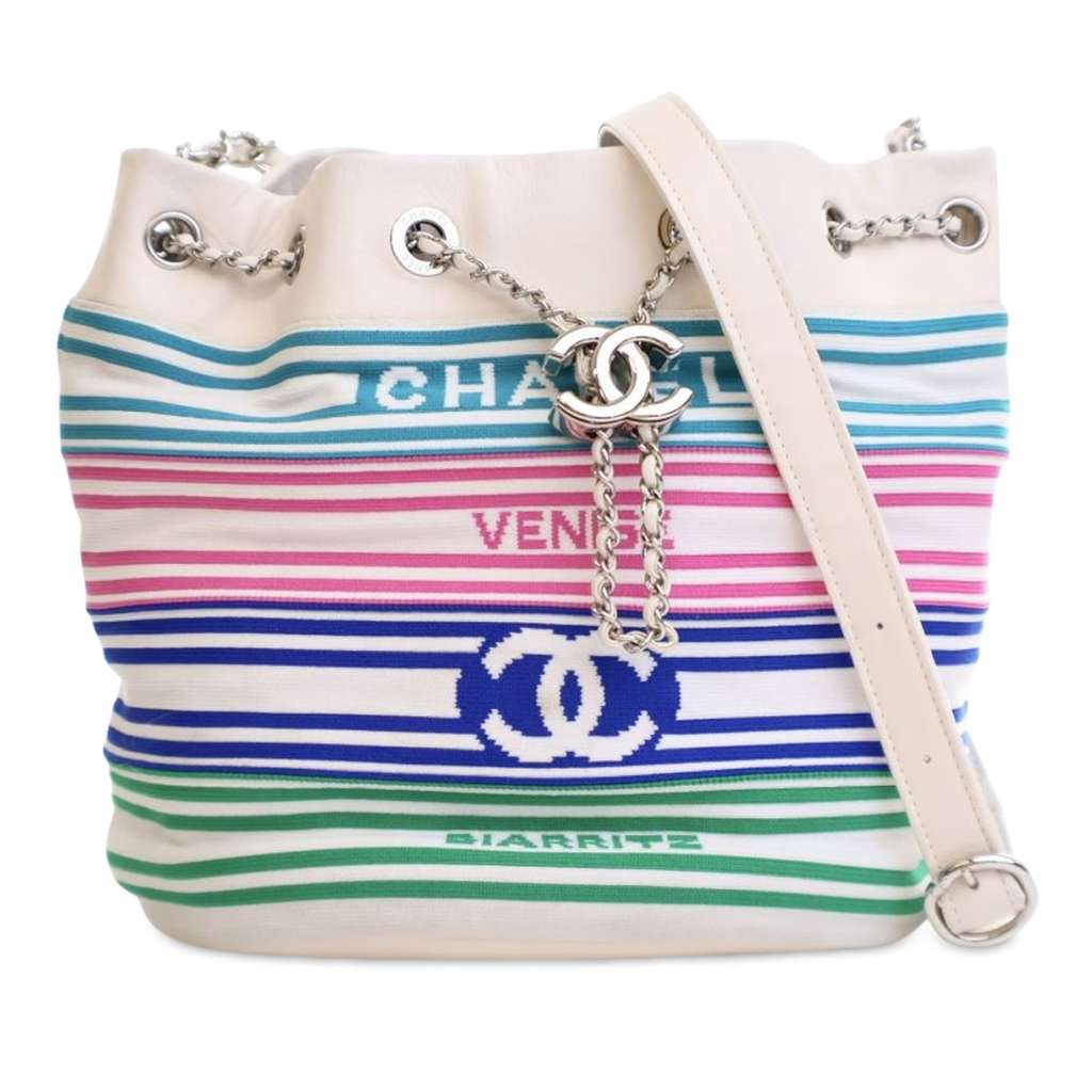 This bucket bag features a fabric and calf leather body, an adjustable leather and leather woven chain shoulder strap, a leather woven chain drawstring with CC embellishment closure, and an interior zip pocket.