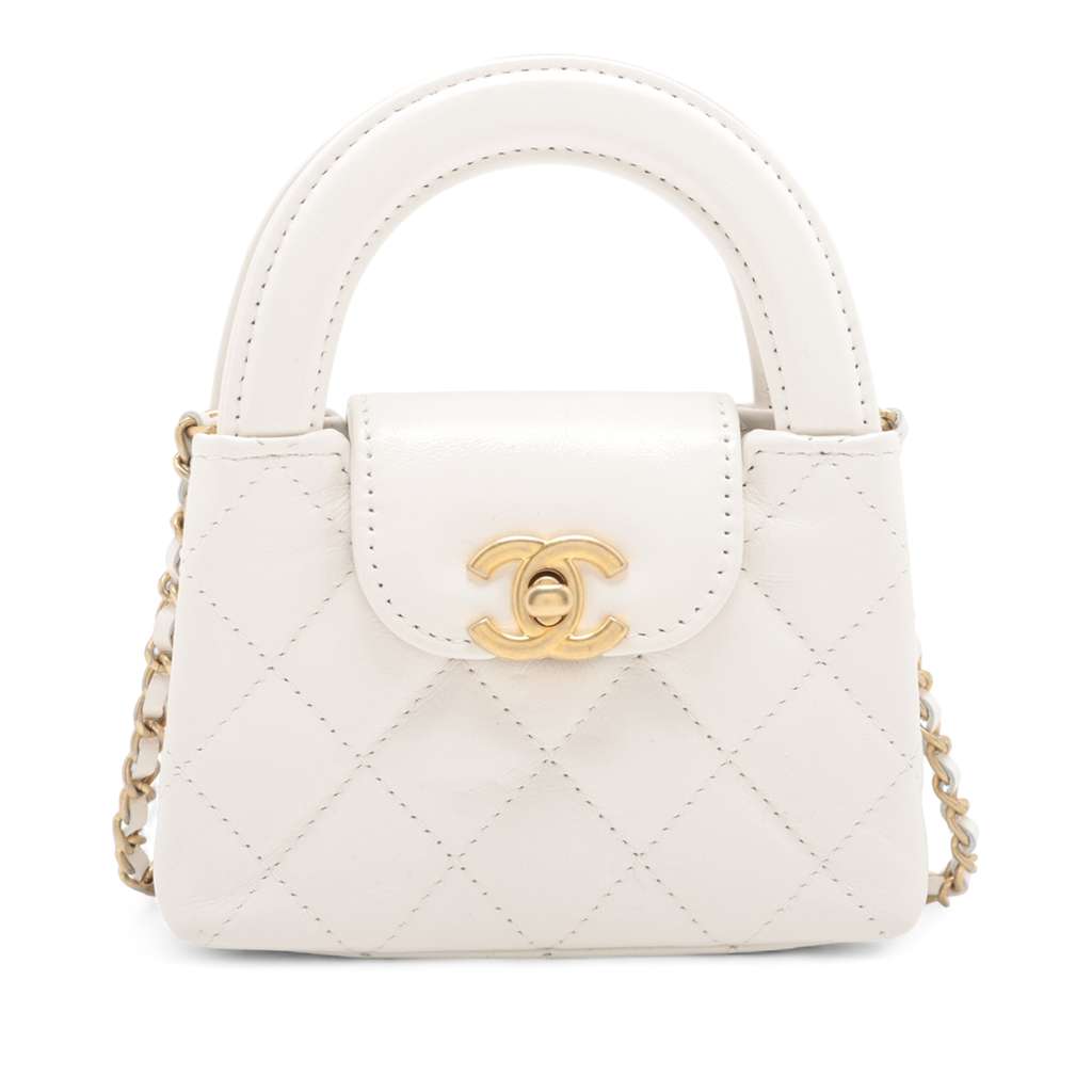 This satchel features a quilted leather body, flat leather top handles, a gold-tone leather woven chain link shoulder strap, a top flap with CC turn lock closure, and an interior zip and slip pockets.