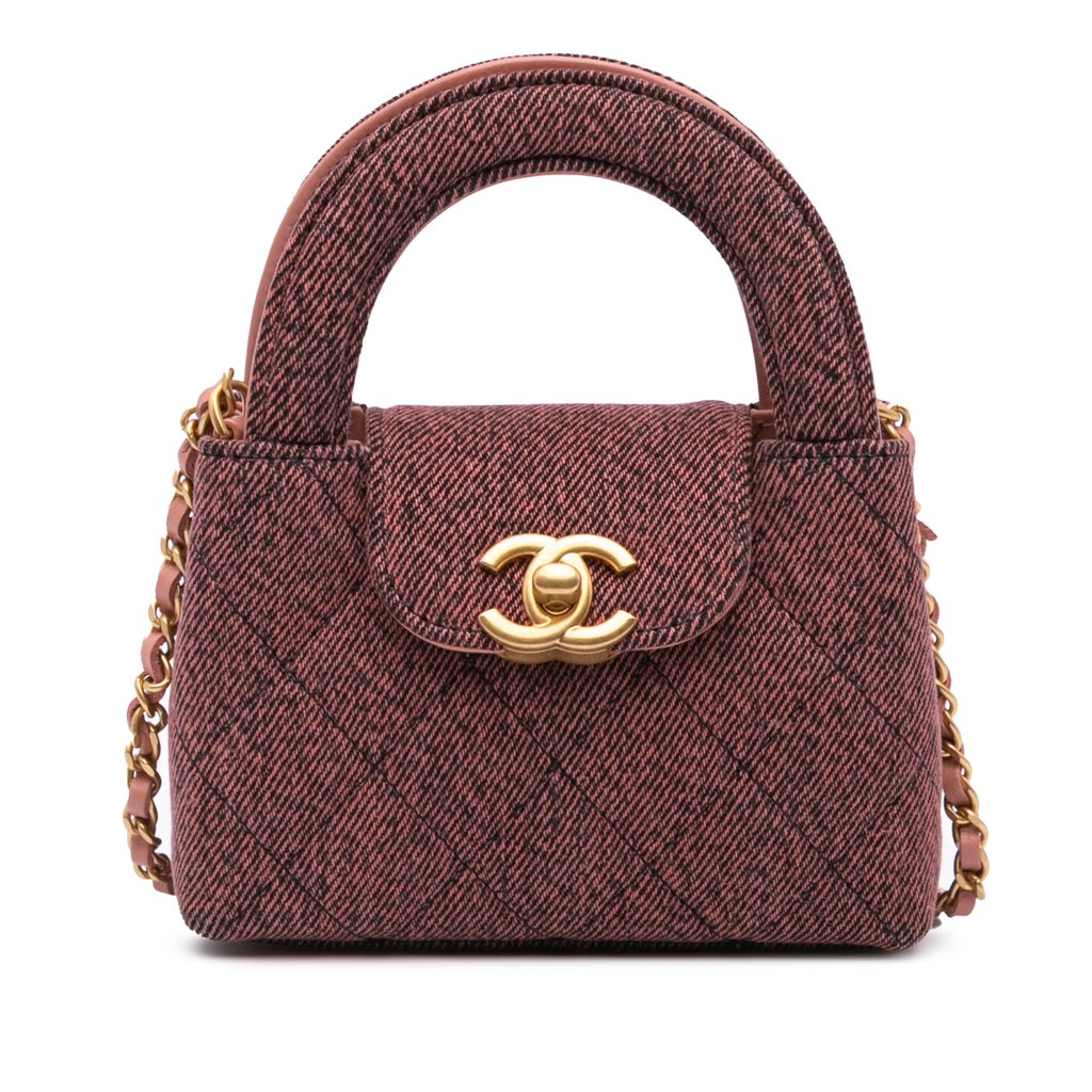 The Nano Kelly features a quilted denim body, flat handles, a leather-woven chain strap, a top flap with CC turn lock closure, and an interior slip pocket.