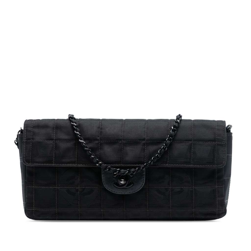 This shoulder bag features a nylon body, a nylon woven chain link strap, a front flap with interlocking Cs and a twist lock closure, and interior slip pockets.